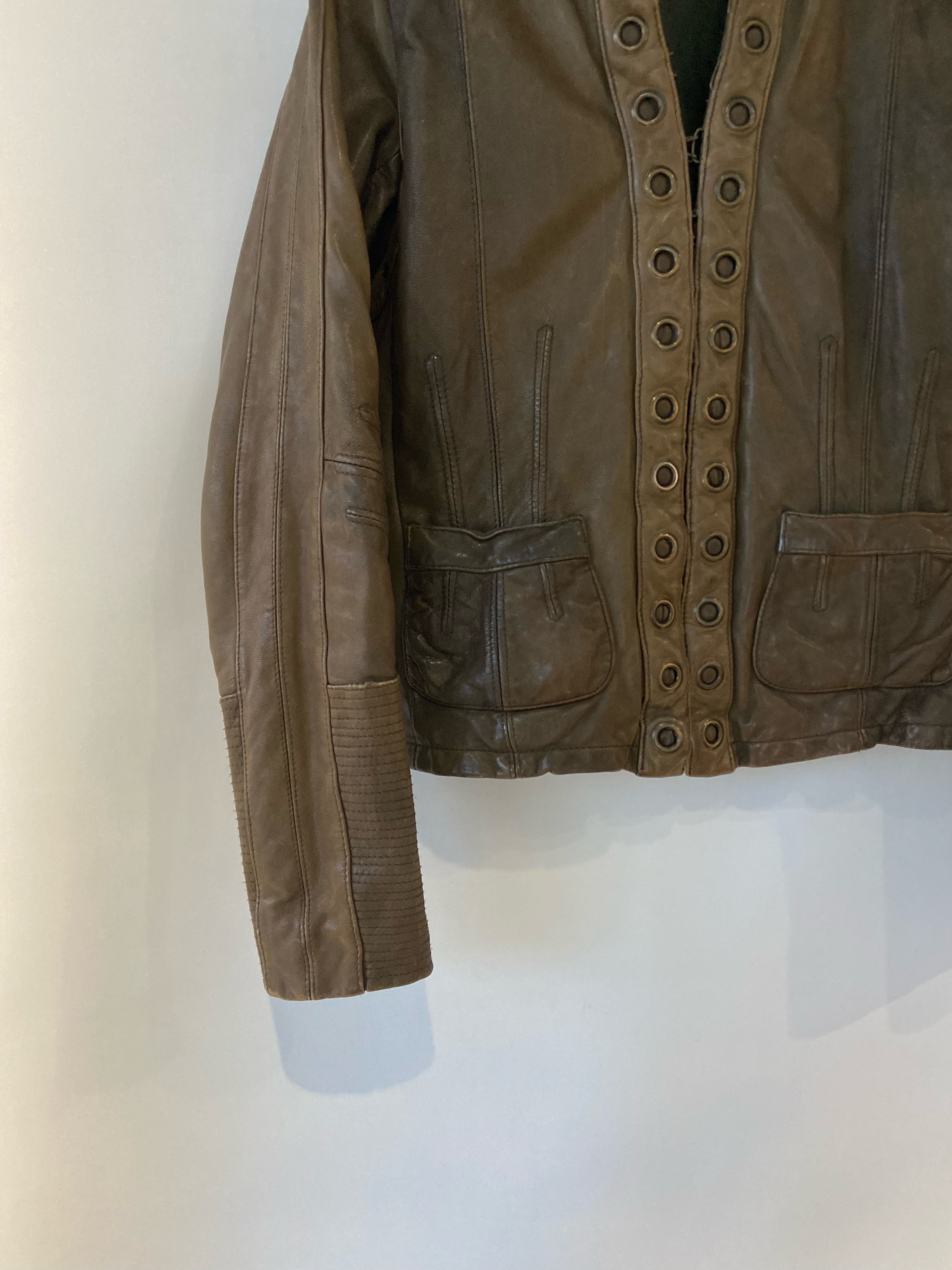 Essentiel Antwerp Dark Olive-Brown Real Leather Jacket with Circular Stud Detailing – Size 38