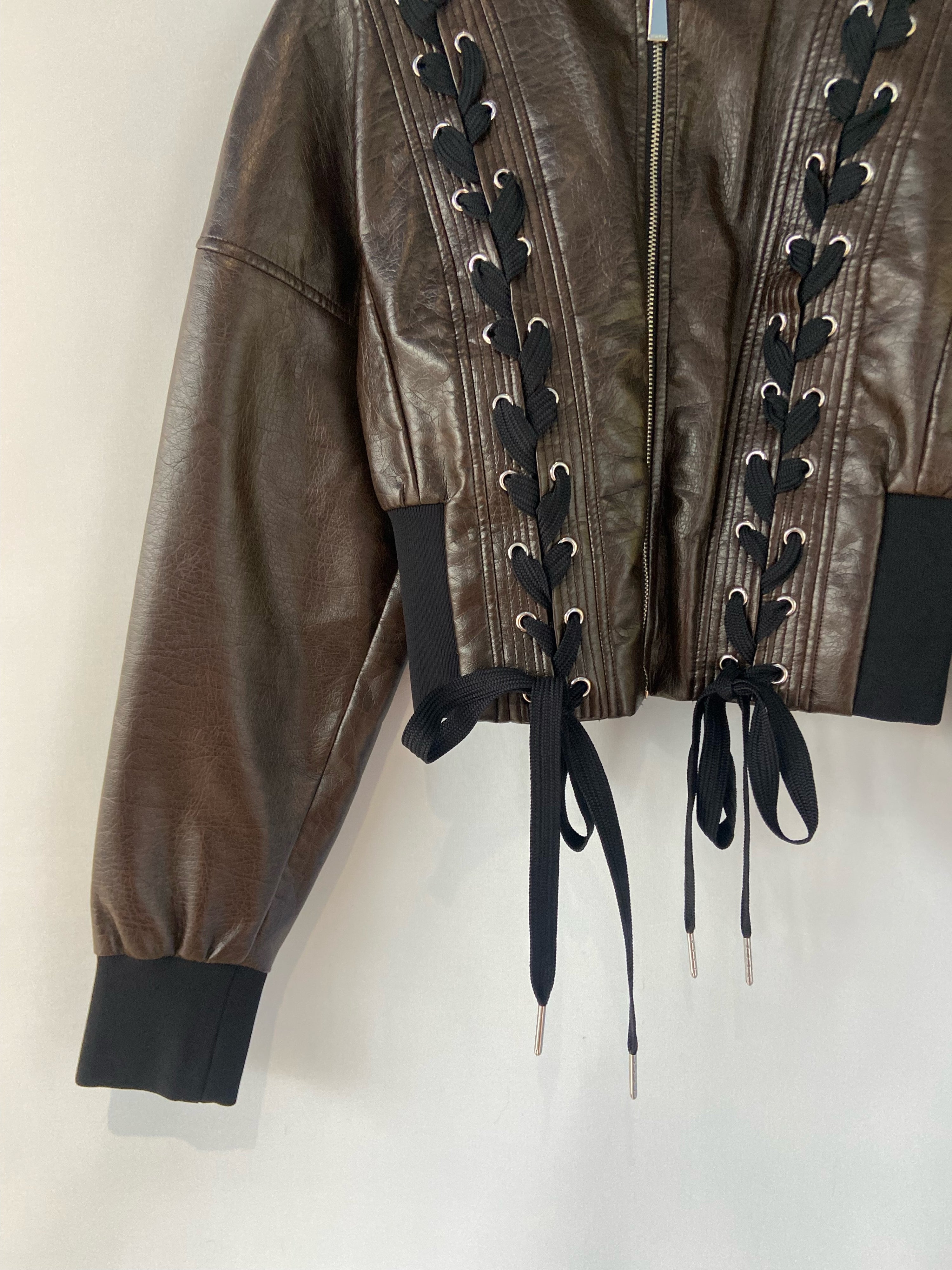 Pinko Cropped Italian Leather Jacket with Ribbed Front Detail – Dark Brown