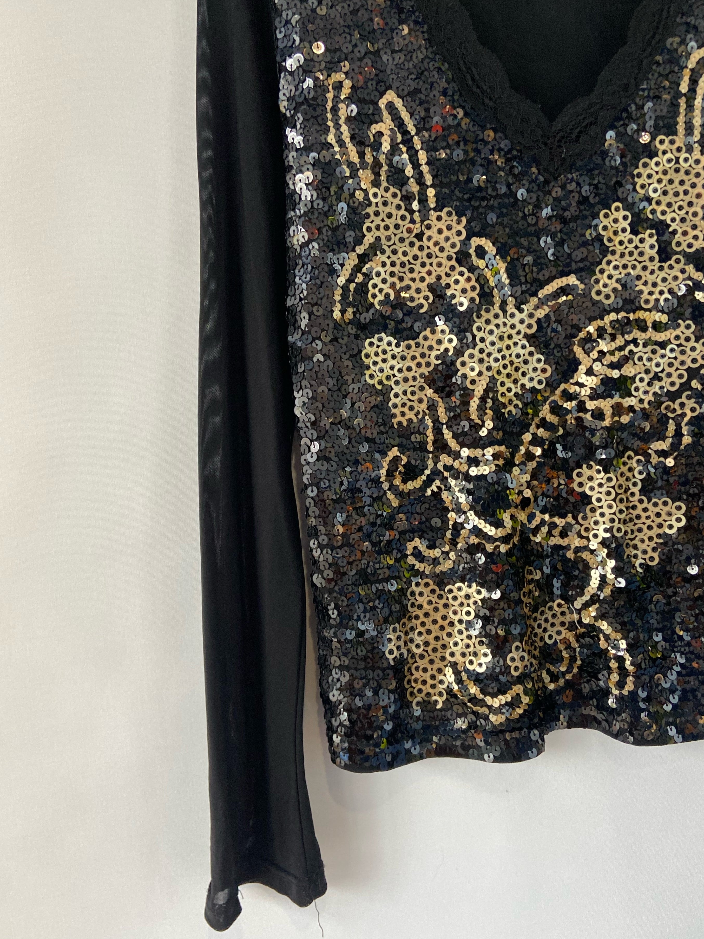 Ribellissima Vintage Black Mesh Top with Gold Sequin Embroidery – Italian L